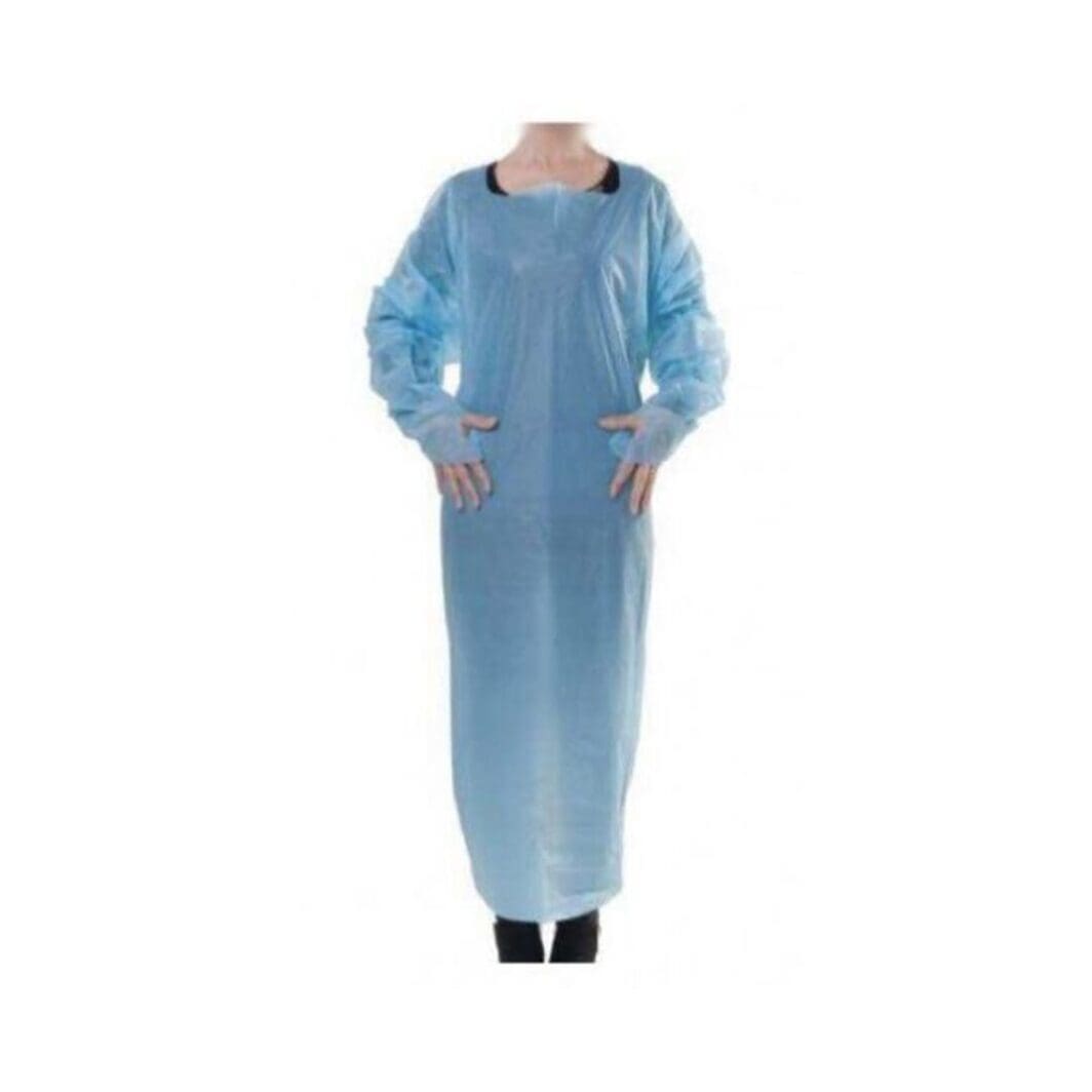 Blouse de protection en CPE de haute qualité. Elle protège efficacement des projections, des bactéries et des virus.