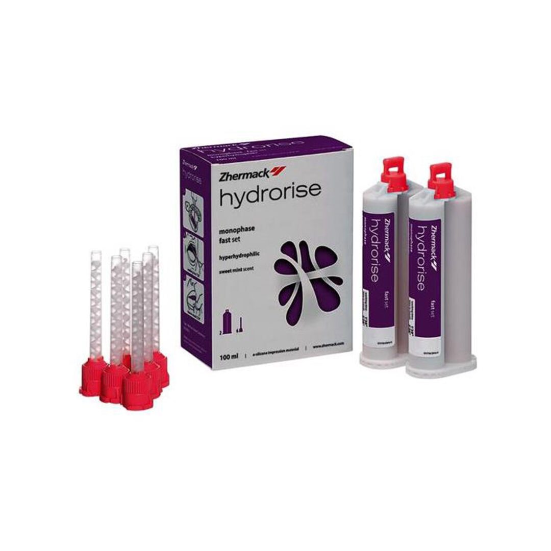 L’hydrorise est un silicone pour tous types d’empreintes, il a une parfaite affinité avec l’eau ce qui permet d’obtenir des reproductions précisent des détails en milieu humide. Le silicone permet de s’adapter à toutes les morphologies dentaires, il ne coule pas et à une capacité à glisser sous la pression. Il résiste aux déchirements.