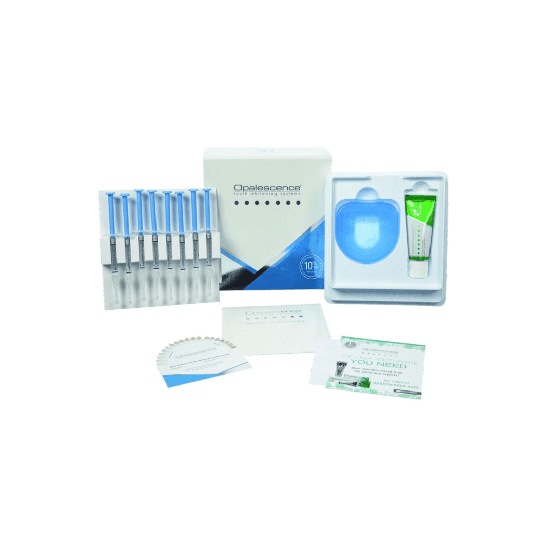 Le kit dentiste contient : 8 seringues de 1,2 ml (1,50 g) + 1 dentifrice Opalescence de 25 ml +1 teintier + 1 étui à gouttière + 1 trousse Opalescence